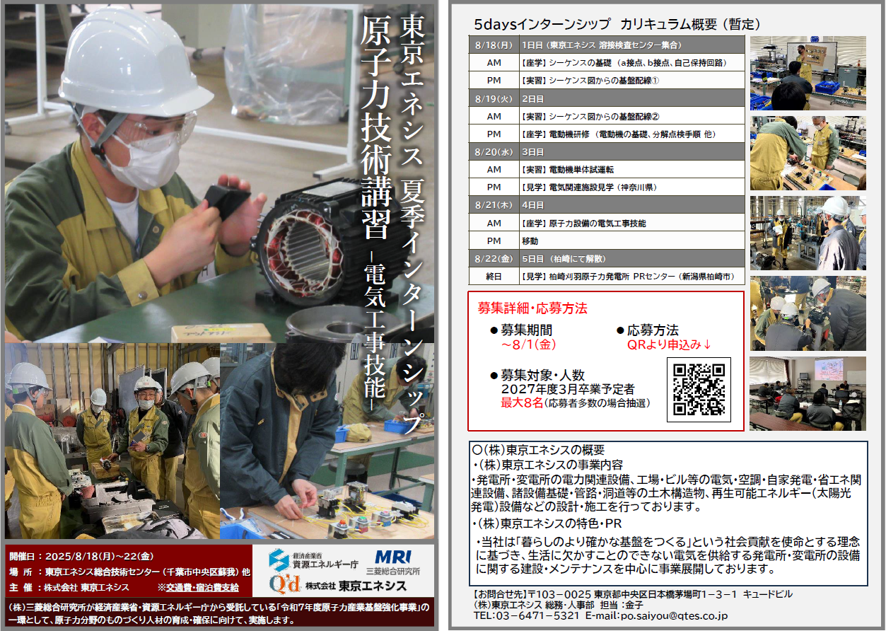 株式会社東京エネシス(本社:東京都中央区、代表取締役社長:眞島俊昭、以下「当社」)は、経済産業省・資源エネルギー庁が推進する「令和7年度原子力産業基盤強化事業(以下「本事業」)」の一環として、原子力分野のものづくり人材の育成・確保に協力しています。