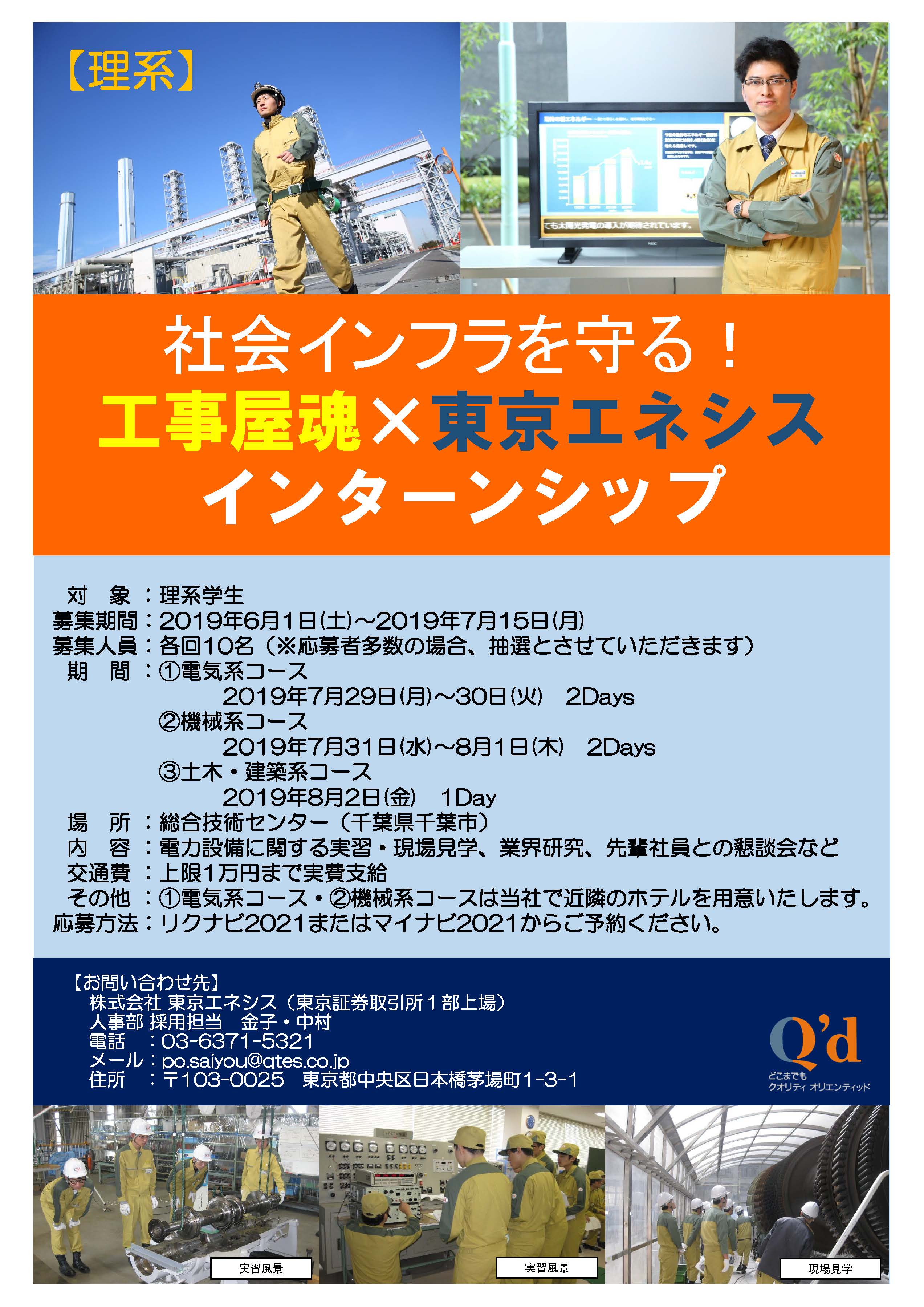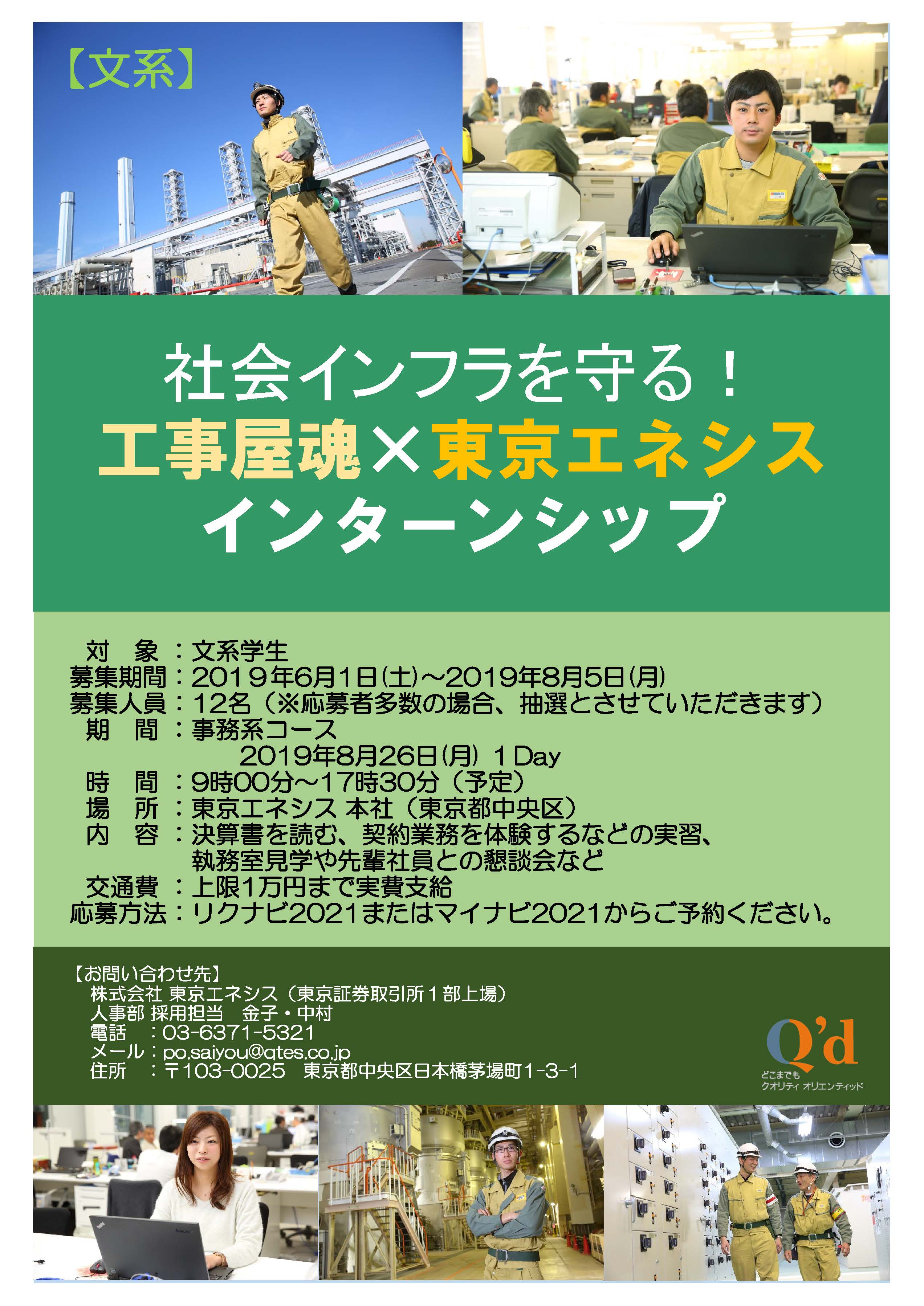 学生のみなさんに東京エネシスの仕事を知っていただくため、インターンシップ 2021(夏)を開催いたします。 当社の仕事のスケールや70年に亘り先輩から後輩に継承されてきた『工事屋魂』という「工事に掛ける意気込みや心構え」の一端を感じ取っていただければ幸いです。
