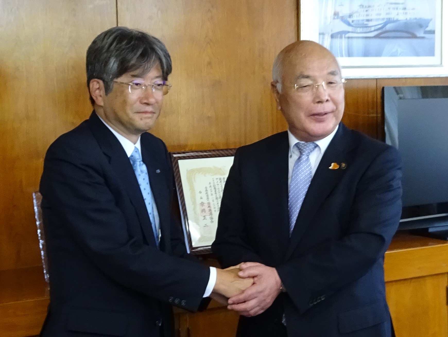 ご訪問の最後に握手をする境港市長 中村 勝治様(右)と当社・熊谷社長