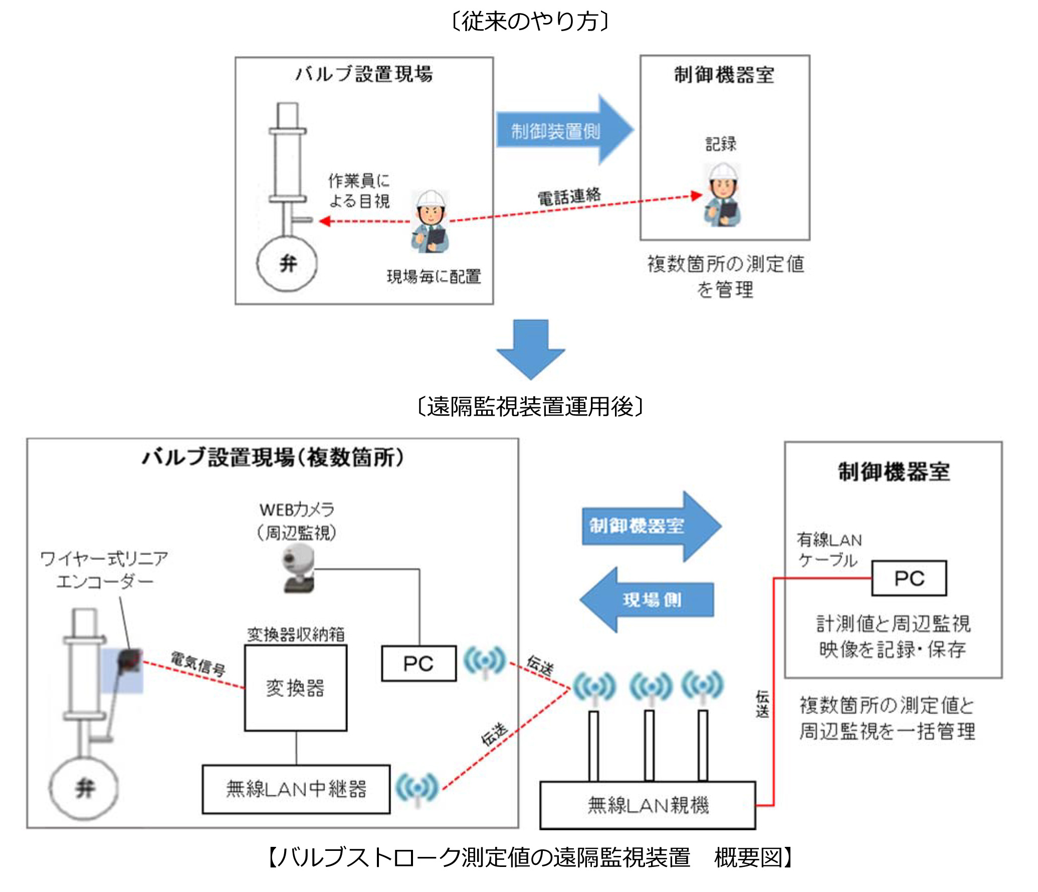 1.WEBカメラによる映像を、バルブ設置現場にあるPC・無線LAN親機を介し制御機器室にあるPCへ伝送
