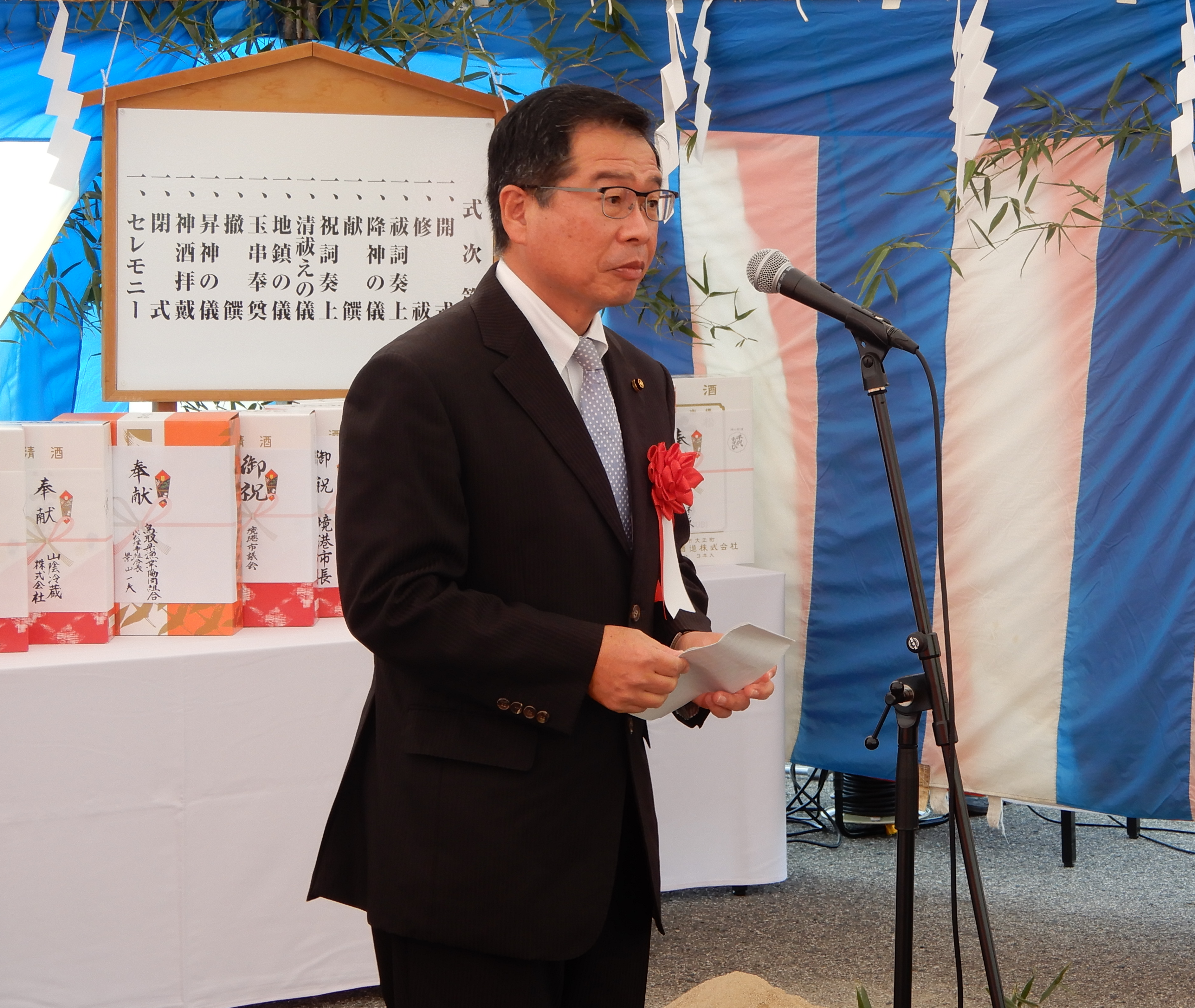起工式の後、ご来賓の境港市長・伊達憲太郎様から「この地域の発展に寄与する施設と期待している。一日も早い完成を当市としても最大限の支援をしたい」、また、境港市議会議長・森岡俊夫様から「新たな木質バイオマス発電事業の開始は、市民の地球環境問題の関心を高める。境港エネルギーパワーの社名は境港市から「力」がみなぎるイメージだ」とのご祝辞を頂戴いたしました。